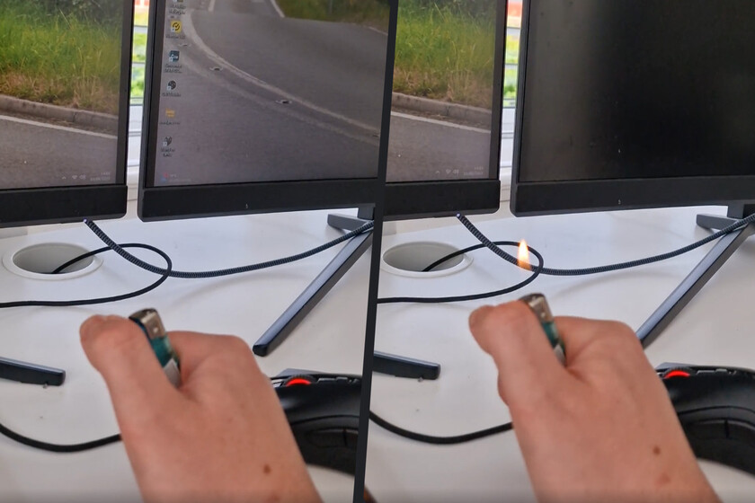 El vídeo compartido en Reddit recientemente no podría ser más esclarecedor. Con el mechero situado cerca del monitor del PC, pero a una distancia lo suficientemente grande como para que no haya una interacción directa: al encender la llama, la pantalla deja de funcionar momentáneamente.