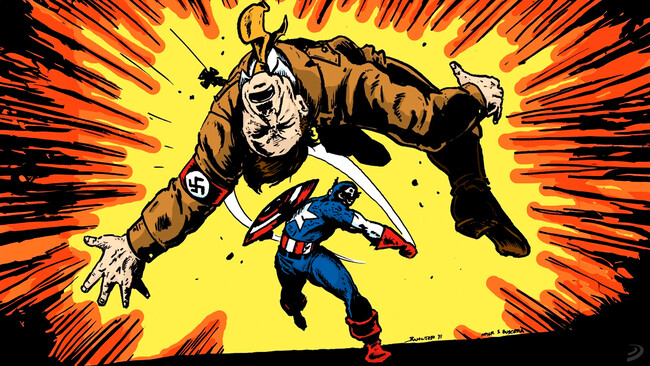 Duarante aquellos años, y especialmente durante el conflicto, muchos personajes de la cultura popular se sumaron a las trincheras mediáticas para participar en un conflicto que tenía mucho de ideológico, pero también de económico. Desde el Pato Donald a Popeye o Superman: todos estos personajes pusieron su granito de arena en el esfuerzo bélico, incluso apelando activamente a los consumidores más jóvenes. En ese escenario el Capitán América no fue solo un símbolo, una bandera con piernas. Fue un arma de propaganda a favor del esfuerzo bélico incluso antes de que EE. UU. entrara oficialmente en la guerra. En sus páginas, Steve Rogers, un enclenque voluntario rechazado por el ejército, se convertía en un supersoldado que defendía los valores estadounidenses y combatía sin piedad al nazismo. Era un mensaje claro, sin matices: hay que enfrentarse al mal. Y ese mal tenía nombre y apellidos.