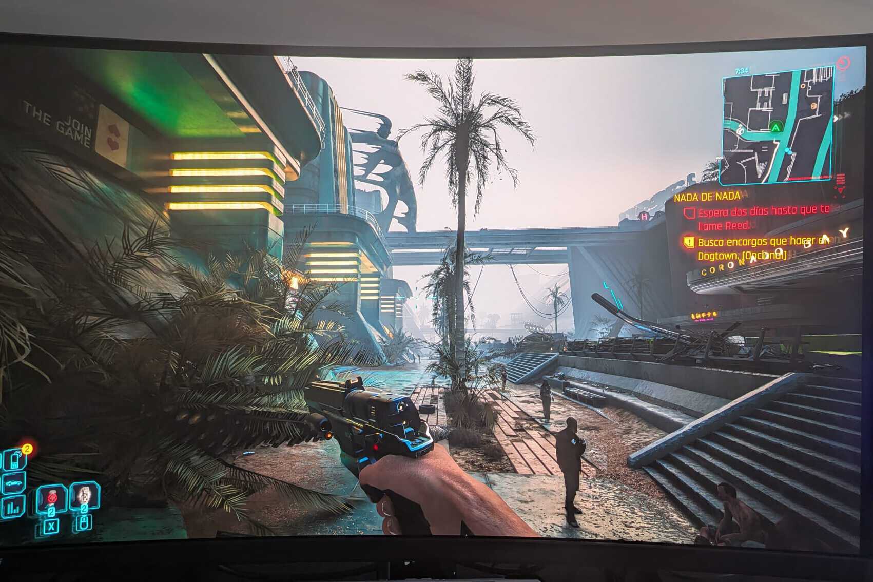 Por un lado, ha sido un acierto incorporar este panel QD-OLED de Samsung de su tercera generación. El QD-OLED ofrece esa profundidad en los negros que sabemos de estos paneles, pero crea un revestimiento que ya me gustaría tener en mi televisor. Incluso tratándose de un panel glossy (reflectante), combina la tecnología de puntos autoiluminados con estos puntos cuánticos para mejorar la precisión de color, pero sobre todo el brillo. En general, los QD-OLED poseen menos brillo que los WOLED, pero en este caso no he tenido ningún problema en visualizar el monitor en todas las condiciones lumínicas de mi habitación. Otra desventaja del QD-OLED suele ser una peor alineación de los subpíxeles, que produce por ejemplo que las fuentes de letra genere un poco de aberración cromática, no ha sido un problema en este caso, y suelo ser bastante pijo con esto. Ni sobre fondo blanco he notado el efecto al ojo desnudo, y solo haciendo la foto con mi móvil y ampliándola al máximo he podido ver las respectivas bandas roja y verde.