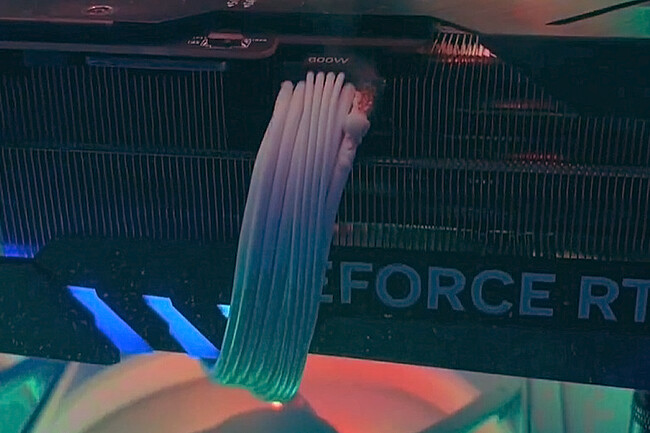 De acuerdo con los detalles que se aprecian en el clip que publicó, la gráfica parece ser una RTX 4090 Gaming Trio de MSI. Sin embargo, quienes conocen el mundillo de las GPU también podrán observar que el cable de 16 pins que conecta la gráfica con la fuente de alimentación no es el que viene de serie con ese modelo; más bien parece algún tipo de adaptador.