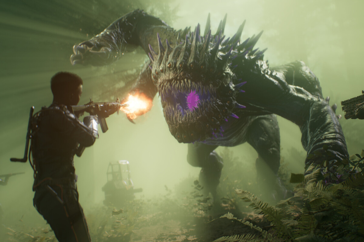 El juego se ambienta en un mundo de ciencia ficción que ha sido arrasado en cuestión de apenas un minuto, y solo queda un pequeño grupo de inadaptados para salvarlo. Un telón de fondo bastante típico, pero que aquí tiene la particularidad de usar un sentido de humor sarcástico y desquiciado que nos recuerda en cierto modo al de Helldivers 2 —con toda clase de locuras a nivel de 'sandbox', también. Puedes llevar un jetpack, hay cubos extraños en el cielo, y monstruosidades que son moles de dientes y mal rollo.