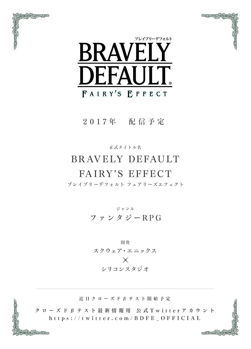 Square Enix ha confirmado el estreno de un nuevo capítulo de la franquicia Bravely Default. Se llamará Bravely Default: Fairy’s Effect y llegará en forma de beta a una plataforma sin determinar en una fecha que tampoco se ha concretado. Por la naturaleza del anuncio en sí, todo apunta a que se estrenará en plataformas móviles, pero el escueto tuit, más allá de la fecha de estreno para el próximo 2017, no ha ofrecido muchos más detalles.