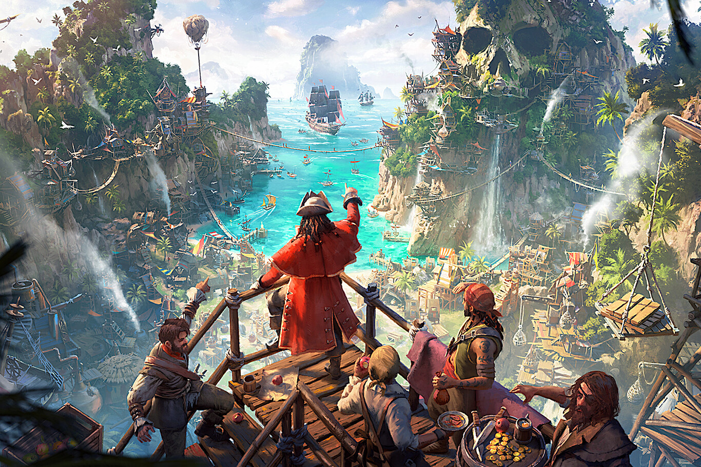 Tienes que construir con la gravedad también en mente. Cuando estableces una base, al principio solo podrás hacer algunas estructuras en forma de pasarelas, pero no pasa mucho tiempo hasta que desbloqueas ingenios como tirolinas o poleas que te permiten aprovechar la verticalidad para transportar más rápidamente las materias primas y los recursos. Es un cambio muy refrescante respecto al planteamiento tradicional de los juegos de gestión, donde ahora no sólo has de tener en cuenta que tus recursos primarios estén conectados con los edificios que los transforman en bienes para tus bucaneros. Tienes que intentar que fluyan rápido.