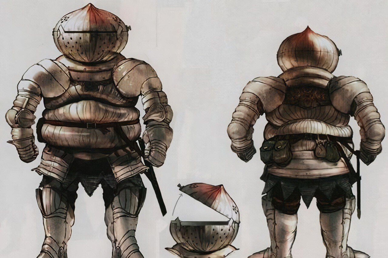 Por supuesto —como bien apuntilla Miyazaki después— en este caso la gordura se atribuye a la armadura y no a la persona que la porta, pero es todo parte de su encanto. "Lo único que lamento de la armadura de Catarina es el casco con forma de cebolla. Habíamos planificado que pudiera abrirse y cerrarse, pero no pudimos implementar esa funcionalidad dentro del juego. Quería que Siegmeyer abriese su casco y comiese algo en cierto punto de la aventura, y no pude llevar la idea por buen camino. Lo siento, Waragai".