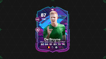 Empezamos por el gran premio que tiene este primer SBC, la carta Flashback de Kevin de Bruyne. El medio centro del Manchester City encuentra en esta versión de su carta un GRL algo inferior (87 frente a su 91 en versión Oro), pero que lo propone como una alternativa a la misma. El ritmo era su talón de aquiles y ahora tiene un valor mucho más aceptable. El precio a pagar ha sido reducir ligeramente sus valores en Tiro, Pases y Regate, aunque su defensa ha mejorado en la misma medida y el físico se mantiene .
