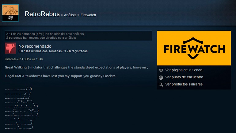 A pesar de la disculpa publicada por PewDiePie, sus seguidores se han alzado contra Camposanto, y han empezado a penalizar seriamente a Firewatch en Steam con sus votaciones y comentarios. Algunos de estas aportaciones de los usuarios ni siquiera se centran en la calidad del juego en sí, sino que simplemente son una muestra de apoyo hacia el conocido influencer. Algunos de estos jugadores etiquetan a Camposanto de “fascista” por su política de demandas por vulneración de la propiedad intelectual. Algunas de estas reviews ni siquiera dejan en la plataforma una opinión real, simplemente el voto negativo del usuario.
