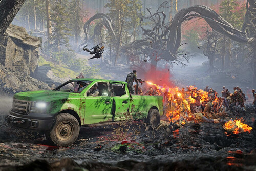 Los coches cuentan con su propia vida y capacidad de deteriorarse, además de hacernos estar pendientes de las reservas de gasolina, al más puro estilo Days Gone; a pesar de que control es sencillo y directo, su gestión y personalización esconden cierta profundidad. Podemos incluso arrollar caravanas de zombies si así lo deseamos, pero es probable que se encaramen a nuestro coche para destruirlo a puñetazos. La labor de los copilotos que se asomen por las ventanas será fundamental para contener la destrucción. De esta forma, los viajes están muy bien pensados para implicar de forma activa a todo el equipo, y se convierten en uno de los pilares de la experiencia, casi al mismo nivel que los propios tiroteos a pie. La narrativa emergente de estas secciones tiene una enorme capacidad para generar anécdotas memorables, como cuando intenté salvar a un compañero de un zombie gigantesco que lo tenía preso atropellándolo, y acabaron cayendo ambos por el barranco.