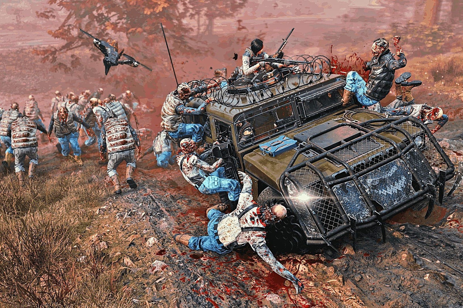 De nuevo, mirando a Roadcraft, las carreteras estarán llenas de baches, agua, lodo... y, aunque sin llegar al realismo de aquel ¿survival? de conducción, deberemos usar un cabestrante para avanzar y no quedarnos atrapados en el lodo. Y es que las físicas del entorno son realistas, o al menos más que la media, y sumergirán nuestras ruedas, llenarán el coche de lodo o nos harán resbalar. De hecho, no todos los coches tienen cabestrante, lo que da aún más profundidad al juego. Moverse por el mapa no es fácil: requiere calcular bien las rutas para avanzar por el escenario y no quedarnos sin gasolina o con el motor ahogado. Así, Toxic Commando se sale de la tónica habitual de usar los vehículos en los PvE como objetos de un solo uso, en su mayoría para ir del punto A al punto B, y los entiende como algo divertidísimo que añade dinamismo y variedad al conjunto.