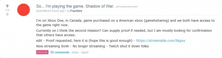 La Tierra Media: Sombras de Guerra se pone a la venta el día 10 de octubre, aunque como ocurre a menudo en juegos de este calibre, algunos fans con mucha suerte han logrado hacerse con copias que se venden antes de lo debido en tiendas físicas, o, en el caso del usuario de Reddit Frackbird, a través de una tienda digital.