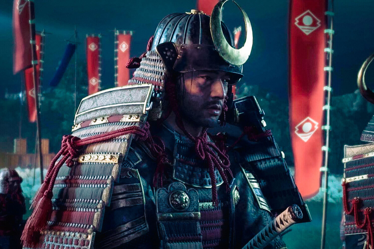 Inspirado en el cine de Akira Kurosawa, Ghost of Tsushima comienza con planos generales aéreos que, junto a los diálogos de Jin, nos anticipan a una guerra imposible de ganar. La primera cinemática plantea un contraste inmenso entre el número de soldados en la colina de la montaña frente a aquellos en la orilla de la playa. Por unos segundos, nuestra mirada cae en un horizonte agobiante lleno de barcos (que parecen infinitos mediante el uso de una composición abierta) y al que estamos a punto de adentrarnos junto a nuestro ejército.