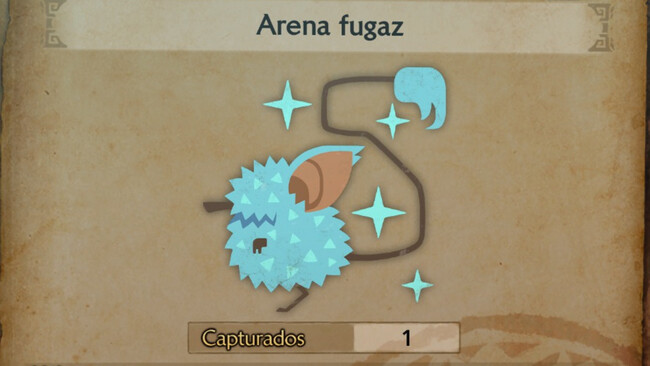 La arena fugaz (sand star en inglés) es en realidad un pequeño roedor similar a un jerbo, que corretea por las dunas del desierto del mismo mapa. Por supuesto, la idea es capturarlo con tu red de caza como harías con el resto de criaturas que te han ido pidiendo hasta ahora; aunque esta en concreto es algo más desafiante de conseguir porque huye de ti a una velocidad que ni siquiera tu Seikret es capaz de igualar.