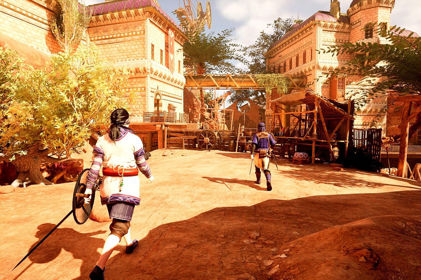 Y es que, aunque hablamos de un comienzo en frío dentro de una civilización que vive a la sombra de enormes árboles, sin mayor idea de qué estamos haciendo más allá de pequeñas líneas de diálogo —aquí la primera anotación: de momento no hay actuación de voz, pero la habrá— de los NPC que nos encontramos, y una cinemática que eleva el valor narrativo de Outward 2 por encima de su precuela, este nuevo juego se ambienta 50 años después del primer Outward. Tras habernos acusado del asesinato de un guardia, a pesar de que existen pruebas que incriminan a otro ciudadano, seremos expulsados del reino con una única oportunidad de volver: encontrar a quien nos tendió la trampa. Eso sí, por ahora, lo que hay en Outward 2 no es sino una mínima parte de lo que habrá. De momento, lo más importante eres tú, tu mochila, un vasto mundo y la sensación constante de que vas a morir.