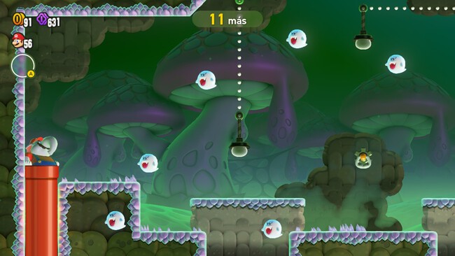 La gracia está en que, en ese primer escenario, tenemos disponibles un par de lámparas y un bloque temporizador. Cuando Mario golpea ese botón, las lámparas se encienden y todos los fantasmas que estén en el halo de luz quedarán eliminados. Además, disponemos de una anilla para mover las lámparas, algo esencial para derrotar a los fantasmas. No os preocupéis porque es un escenario muy sencillo.