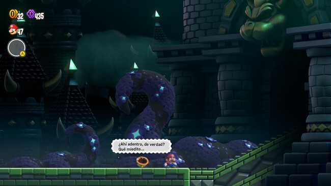 Después, ya en el Mundo Maravilla, lo único que tendremos que hacer es avanzar en un recorrido lineal sin morir, hasta encontrar la Semilla. No os preocupéis porque no tiene pérdida. Eso sí, tened cuidado porque el efecto de la Flor en este nivel es que todo va a cámara rápida.