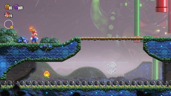 Cuando por fin seamos invencibles, podremos caminar por encima de las plantas y llegar a la flor parlante, volviendo a la izquierda. Si la golpeamos (con un salto de culo), aparecerá la Flor Maravilla. Una vez en el Mundo Maravilla, solo tendremos que avanzar por un recorrido lineal hasta que alcancemos la Semilla al final del camino.