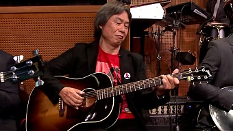 El gran Shigeru Miyamoto demostró que no sólo sabe hacer grandes juegos, sino que también le da a la guitarra con cierta gracia. Arropado por el grupo residente del famoso late night televisivo, Miyamoto interpretó el tema principal de la saga Mario. Genio y figura Miyamoto. Y la cosa viene de lejos.