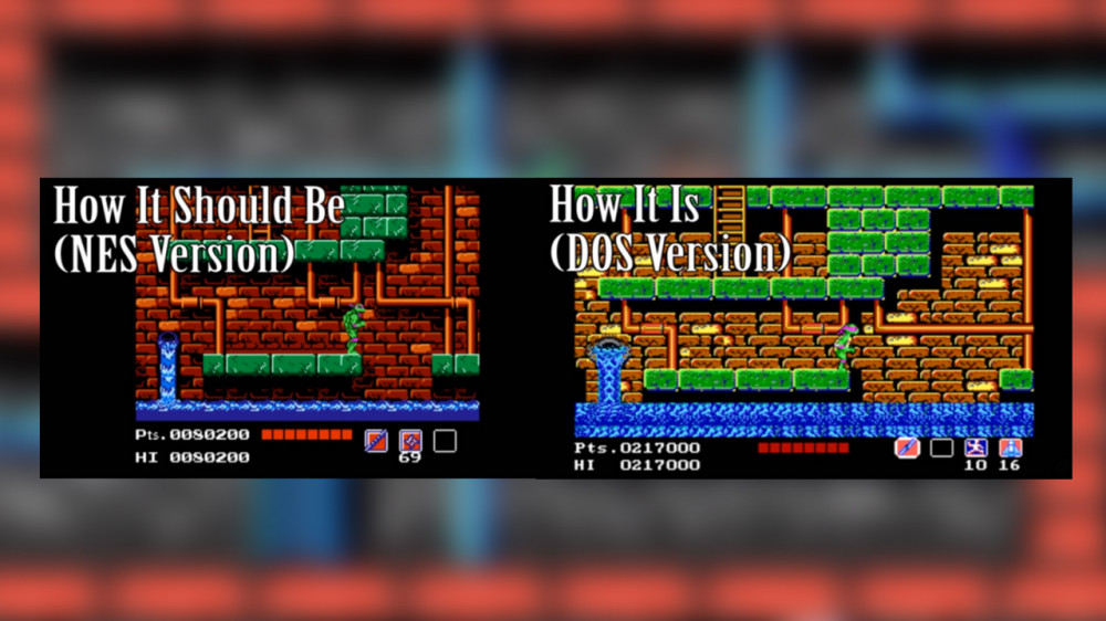 Hubo una adaptación del juego imposible de pasar - No todo es miel sobre hojuelas con el primer juego de las Tortugas, pues también es recordado por sus terribles adaptaciones. De entre las nueve versiones para computadoras, la de DOS es la peor, pues se modificó la geometría del juego y eso hizo que hubiera obstáculos imposibles de superar sin hacer trampa. Este famoso error fue corregido en la versión PAL del juego. (Fuente de Imagen: "LGR - Top 17 Worst PC Games" en YouTube)