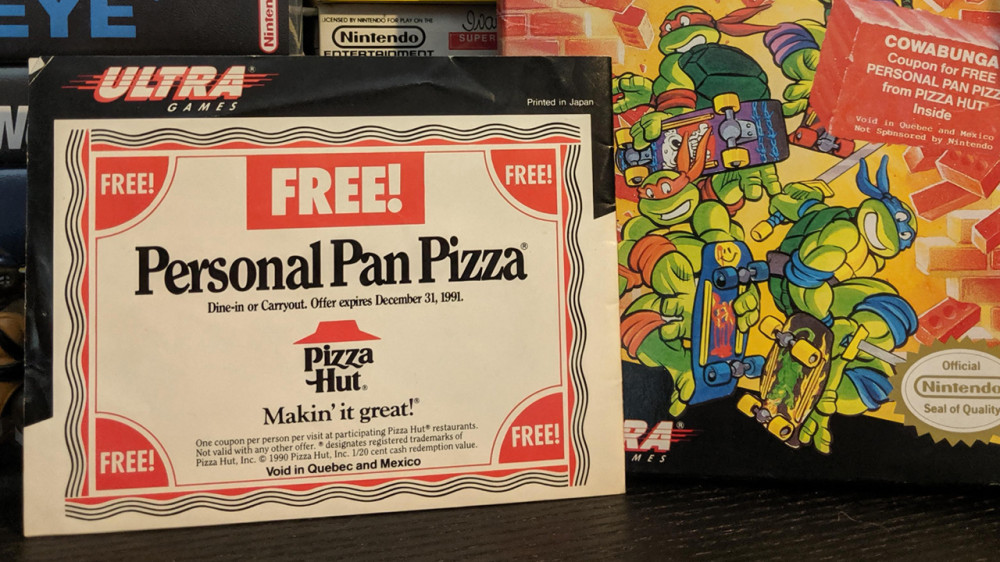 Pizza incluida con el juego - La pizza es todo un ícono de las Tortugas Ninja, por lo que en Norteamérica no podía desperdiciarse la oportunidad para hacer publicidad. Un acuerdo firmado con Pizza Hut fue el responsable de que todas las copias del juego incluyeran un cupón canjeable por una pizza y que dicha versión también tuviera product placement de la marca en sus niveles.