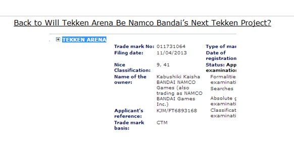 Namco Bandai ha registrado en Europa la marca Tekken Arena, que bien podría hacer referencia a un nuevo título de lucha basado en esta popular saga. De momento, sin embargo, la compañía nipona no ha confirmado esta posibilidad.
