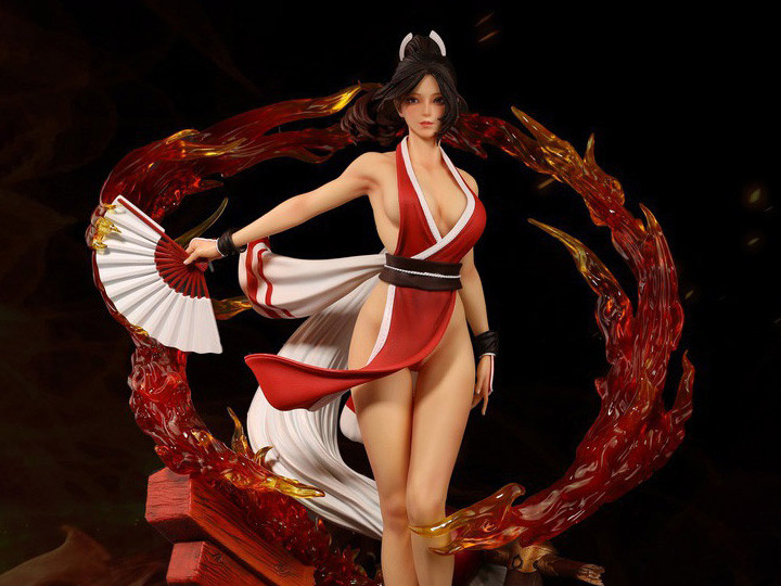 La nueva figura de Mai Shiranui está inspirada en la versión del personaje que vimos en The King of Fighters XIII, y nos muestra a la ninja posando con su abanico mientras se ve rodeada de llamas, propias de sus ataques de fuego, y sobre una base igualmente detallada en la que se postran elementos que resaltan su naturaleza shinobi. Sin embargo, lo que más llama la atención de esta es su tamaño ya que, al tener una escala de ¼, su altura alcanza los 54 cm; es decir, poco más de medio metro.