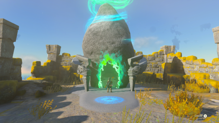 Cuando llegues, te darás cuenta de que no hay ningún santuario, y eso es porque tendrás que desbloquearlo haciendo una misión que te da el gólem de la zona. Si es la primera vez que lo haces, te explicará un poco sobre que va la prueba.