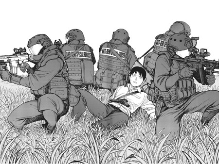 No quiero arruinarte demasiados detalles por si te interesa seguir la historia por tu cuenta, pero al menos sí te diré que en Ajin, las fuerzas armadas no son en absoluto moco de pavo. Incluso si no tienen poderes, que teóricamente los pone en desventaja frente a los individuos a los que cazan, son capaces de hacer suya la escena; y desde el anonimato, representan una presión ambiental máxima para los personajes con nombre.