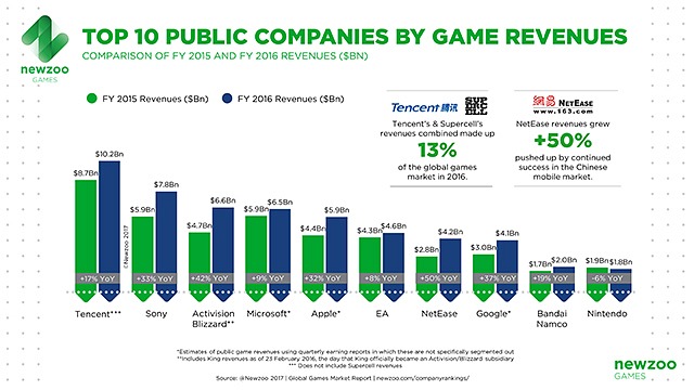 La firma Newzoo Global Games Market Report ha hecho público su informe anual sobre el estado de las grandes empresas de videojuegos, y éste nos deja un crecimiento generalizado para las 25 compañías más grandes del sector. El total de las 10 principales, de hecho, exhibe un aumento en sus ingresos de 70.400 millones de dólares a lo largo del pasado año 2016, concretamente un incremento del 17%.
