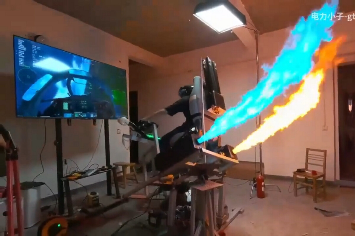 Blyat (el usuario en cuestión) es conocido por sus alocadas creaciones y, como era de esperar, esta es otra de ellas. El proyecto fue difundido de forma original en bilibili, una red social exclusiva del mercado chino que sirve a los usuarios del país asiático para conectarse entre sí. Así, el simulador no solo es sorprendente por la idea en torno al mismo, sino también por la ejecución, ya que incluye postquemadores que lanzan llamas reales al acelerar al máximo. Si esto ya suena alocado, lo más increíble es que es solo el comienzo.