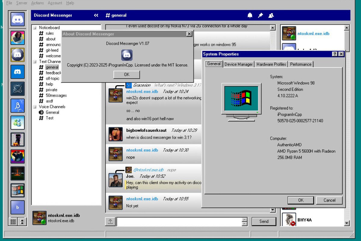 Como indica TechSpot, ya es posible utilizar esta plataforma tanto en Windows 95 como en Windows 98. Así, esto se debe a la existencia de Discord Messenger, un programa no oficial desarrollado por iProgramlnCpp como una alternativa retrocompatible con múltiples versiones de Windows. Por ello, aunque está diseñado para rendir con Windows 2000 y otros sistemas operativos posteriores, el desarrollador confirmó que funciona incluso en versiones más antiguas. No obstante, Discord ha sido tajante al respecto: utilizar este cliente infringe las normas y puede acarrear la suspensión de cuentas.