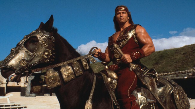 En Red Sonja (El Guerrero Rojo en España, por aquello de hacer pensar que Schwarzenegger era el prota), Schwarzenegger interpreta a un temible guerrero de melena leonina y que a todos los efectos es Conan. Pero no es Conan, se llama Kalidor. Y hay una historia en los motivos de este curioso cambio. Red Sonja, protagonizada por Brigitte Nielsen, no es la tercera película de la saga Conan porque Dino De Laurentiis, aunque tenía los derechos para realizar tres filmes del personaje, decidió producir una historia separada basada en la guerrera de los cómics, pero manteniendo elementos visuales y temáticos de las películas de Conan. Vamos, que quiso hacer cuatro películas de Conan y pagar por tres.