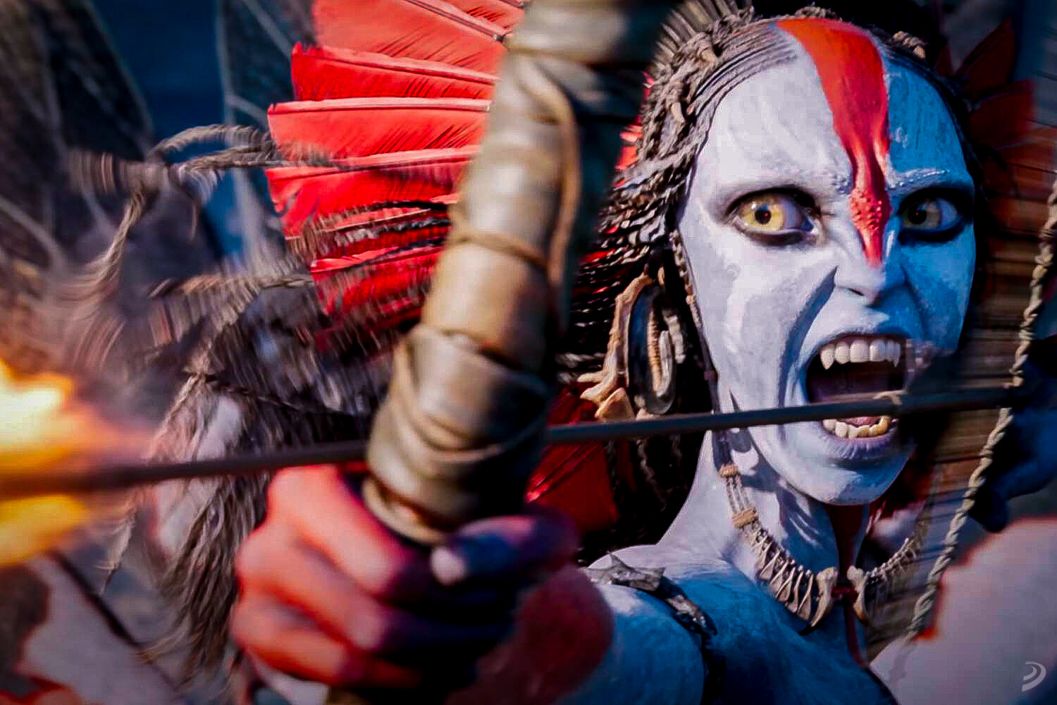 Una de las mejores ideas de la película es el personaje de Varang, la líder guerrera y religiosa de un nuevo clan de navi que demuestra que todavía hay historias que contar en Pandora que son originales e interesantes, aunque la película pase por ellas de puntillas. Ojalá alguien me explique el origen de su tatuaje, mezcla del udyat y el jamsa, porque estoy intrigadisimo. Este nuevo personaje me ha fascinado, pero finalmente queda desaprovechado, y es una lástima, porque del reparto de personajes heredados al final la única que para mí tiene algo de interés es Neytiri (Zoe Saldaña), que destaca en azul eléctrico entre un montón de personajes que dicen poco, trasmiten menos, y que apenas hacen avanzar la historia de la lucha por la libertad de Pandora. Y mira que un metraje de tres horas y 17 minutos dan para contar cosas…