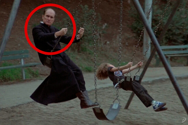 Da miedo, ¿verdad? Resulta inquietante ver ahí a Duvall, vestido con sotana, balanceándose entre una multitud de padres que caminan junto a sus hijos. Es tan bueno el momento que parece algo calculado, un movimiento muy meditado por Philip Kaufman. Sin embargo, lo cierto es que fue una decisión algo improvisada... que pudo rodar con un "colega" que, daba la casualidad, pasaba por ahí: