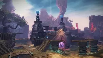 Presentación del nuevo mapa PvP Martillo Celestial, un laboratorio asura de alta tecnología equipado con plataformas de salto, paneles de suelo que se desmoronan y un megacañón gigante.